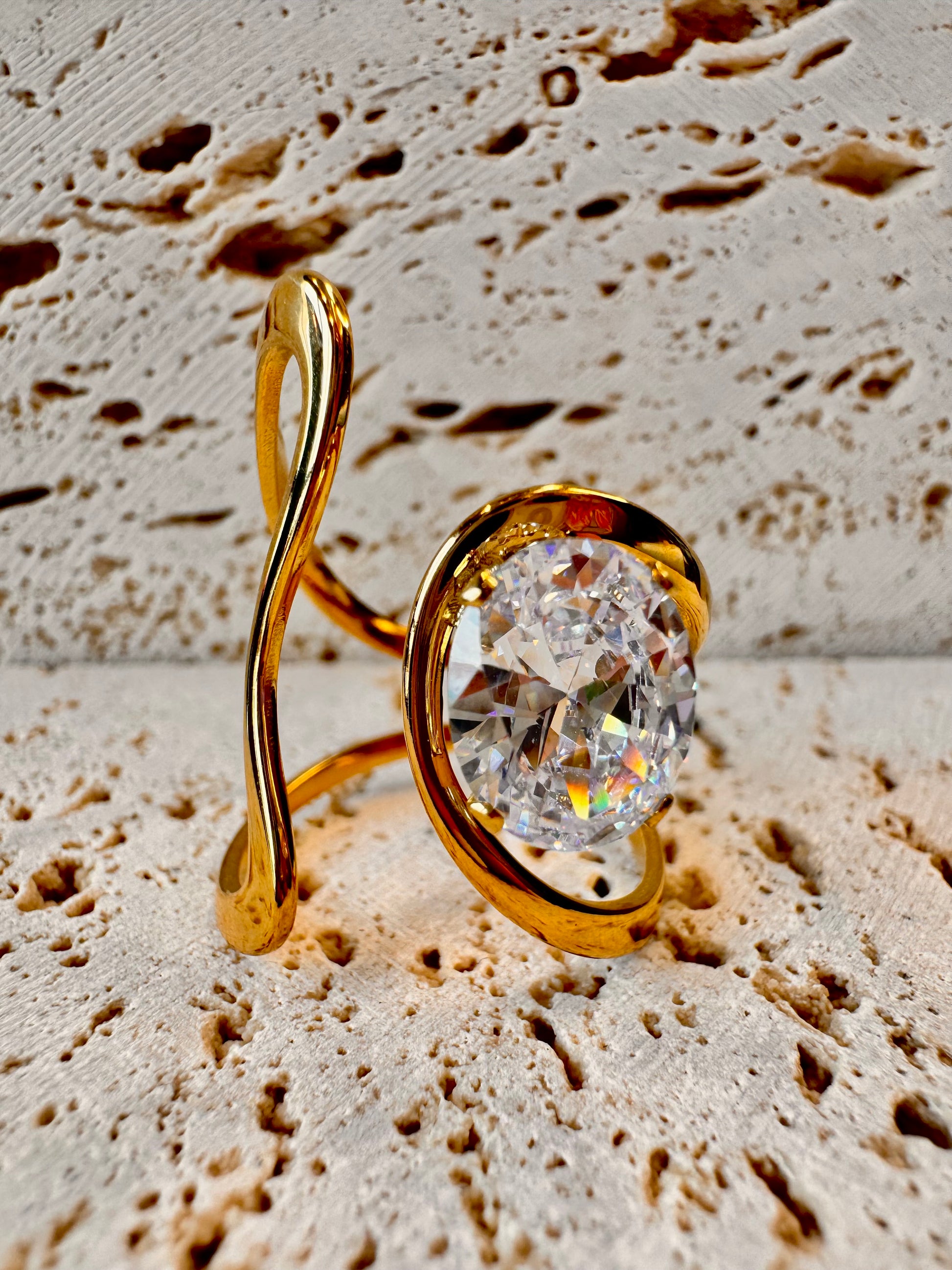 Linee sinuose che si intrecciano in un abbraccio elegante, avvolgendo una pietra radiosa che riflette equilibrio e bellezza senza tempo.